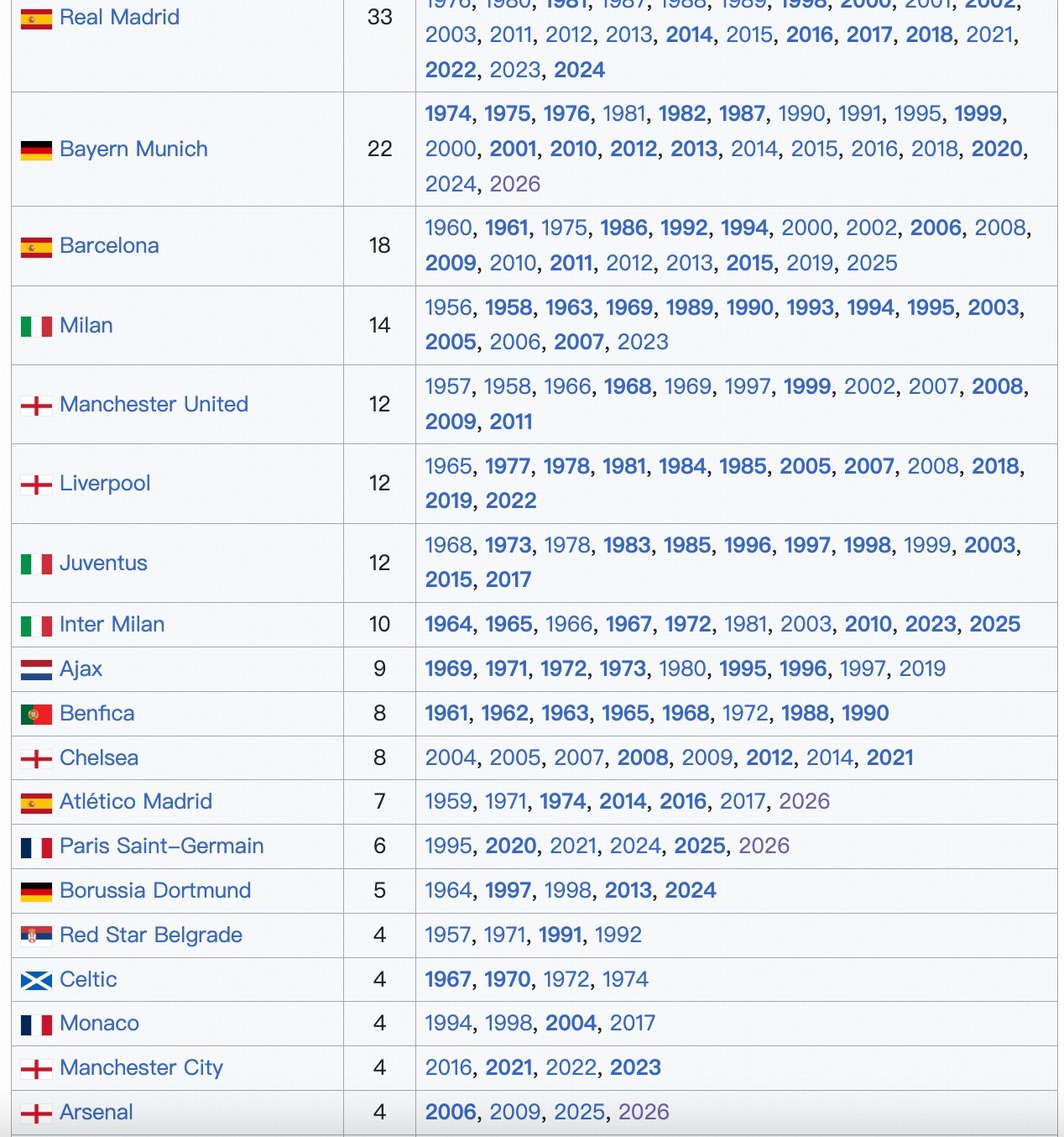 拜仁晋级欧冠四强的次数(22),比马竞(7)、巴黎(6)、阿森纳(4)三支俱乐部晋级欧冠四强的总和还多5次(17)。